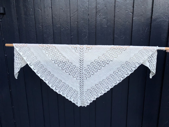 Dette sjalet strikket jeg tidligere i vinter. Det er strikket i Yaku fra Camarose på pinne nr. 3. Det ble veldig mykt og godt etter vask og blokking. Det var første gang jeg strikket noe i dette garnet, og jeg er veldig fornøyd . Det gikk med 4 nøster , var vel ca 1 m igjen etter avfellinga, og jeg kan dermed føre 200 gram inn i årets strikkeregnskap. Vingeslag er designet av Bittami.